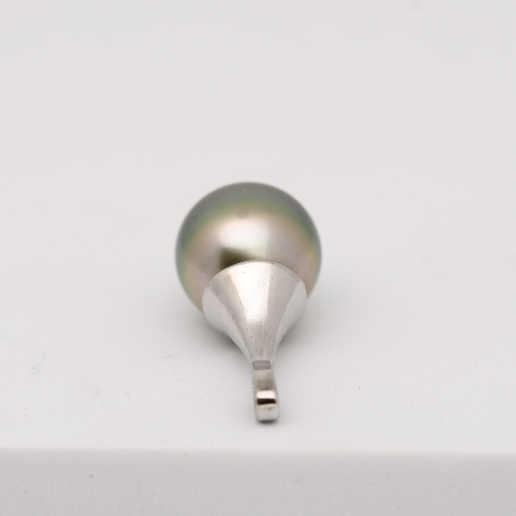 Sa monture en argent 925 rhodié , massif et sobre, met en valeur une perle ronde de 10,7 mm , de qualité A , aux couleurs naturelles gris vert tilleul . Ces nuances douces et profondes sont caractéristiques des perles issues de Pinctada margaritifera , l’huître perlière emblématique des lagons polynésiens. Leur éclat unique résulte d’un processus de culture de plusieurs années, réalisé dans le plus grand respect de l’environnement marin.