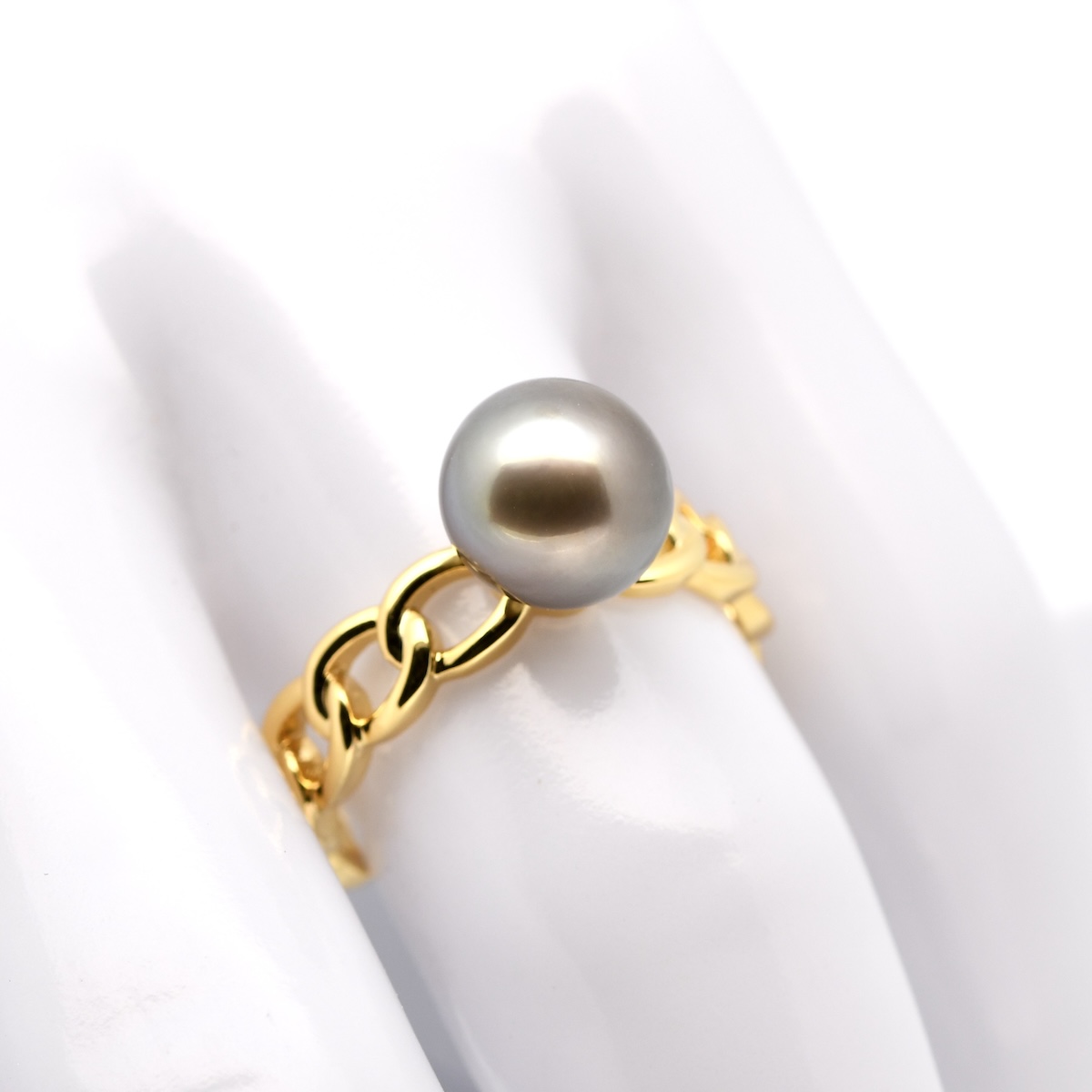 Je l’ai récoltée sur ma propre ferme perlière, elle a été contrôlée, radiographiée, puis transportée jusqu’à mon atelier marseillais. Là, je l’ai montée sur une bague en gold filled jaune 14k, au design de maillons soudés. L’anneau est ouvert, ajustable du 52 au 54, pour s’adapter naturellement à votre main.