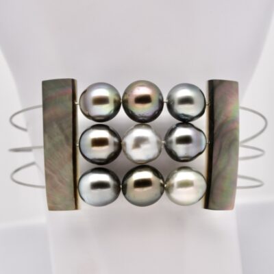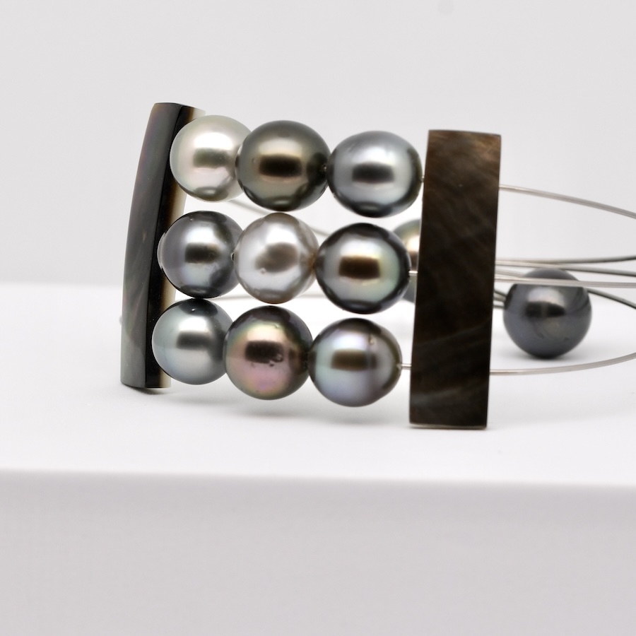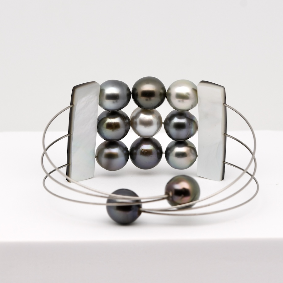 Onze perles de Tahiti semi-baroques aux couleurs naturelles, deux plaquettes de nacre taillées à Manihi.