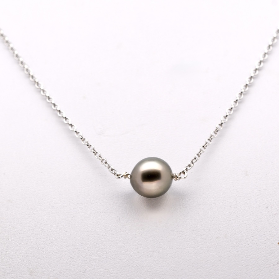 Une perle de Tahiti verte, produite sur ma ferme de Manihi, suspendue à une chaîne en argent.