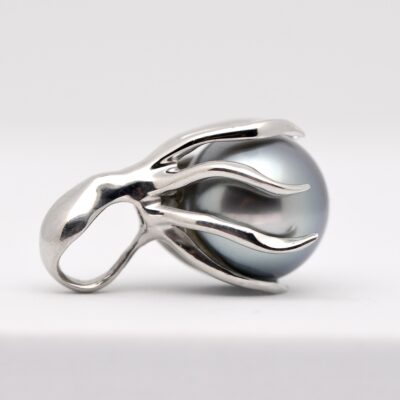 Ses tentacules d’argent enlacent une perle de Tahiti de 9,5 mm, lumineuse et pure. Un bijou vivant, né du lagon de Manihi, symbole de fluidité et de protection.Type : Pendentif