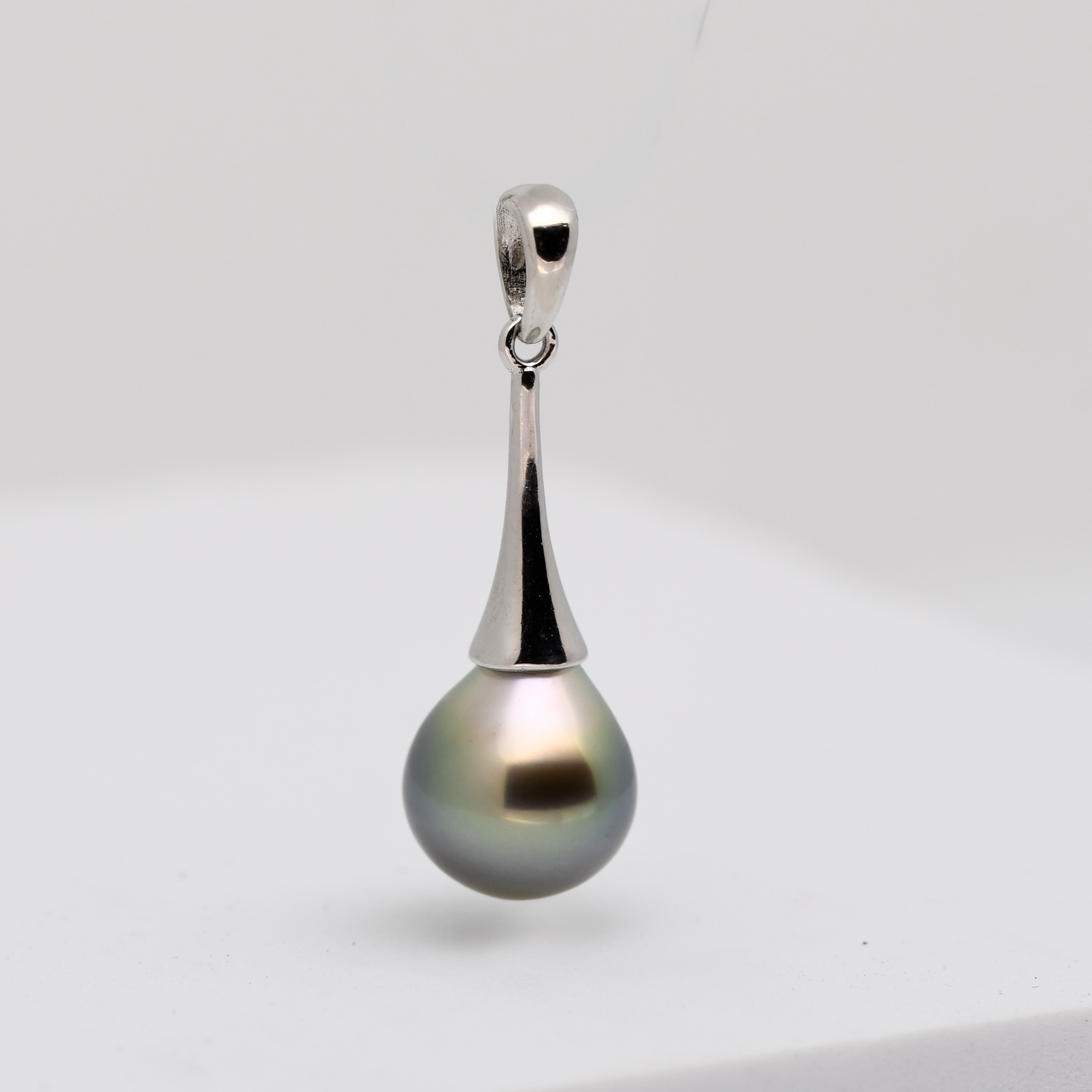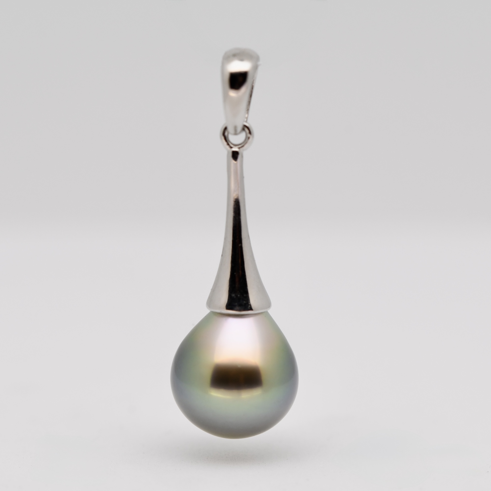 Le pendentif Avera incarne la perfection naturelle et l’élégance intemporelle des perles de Tahiti. Entièrement façonné à la main, il met en lumière une perle en forme de poire de 9,8 mm, parfaite, classée qualité GEM, c’est-à-dire le plus haut niveau de pureté et de lustre existant. Sa surface immaculée, son éclat miroir et son dégradé de couleurs naturelles — du gris au vert, en passant par des nuances bleutées — en font une pièce d’exception.