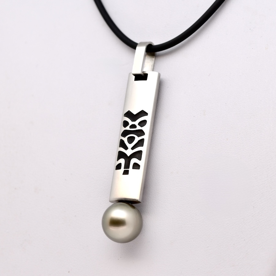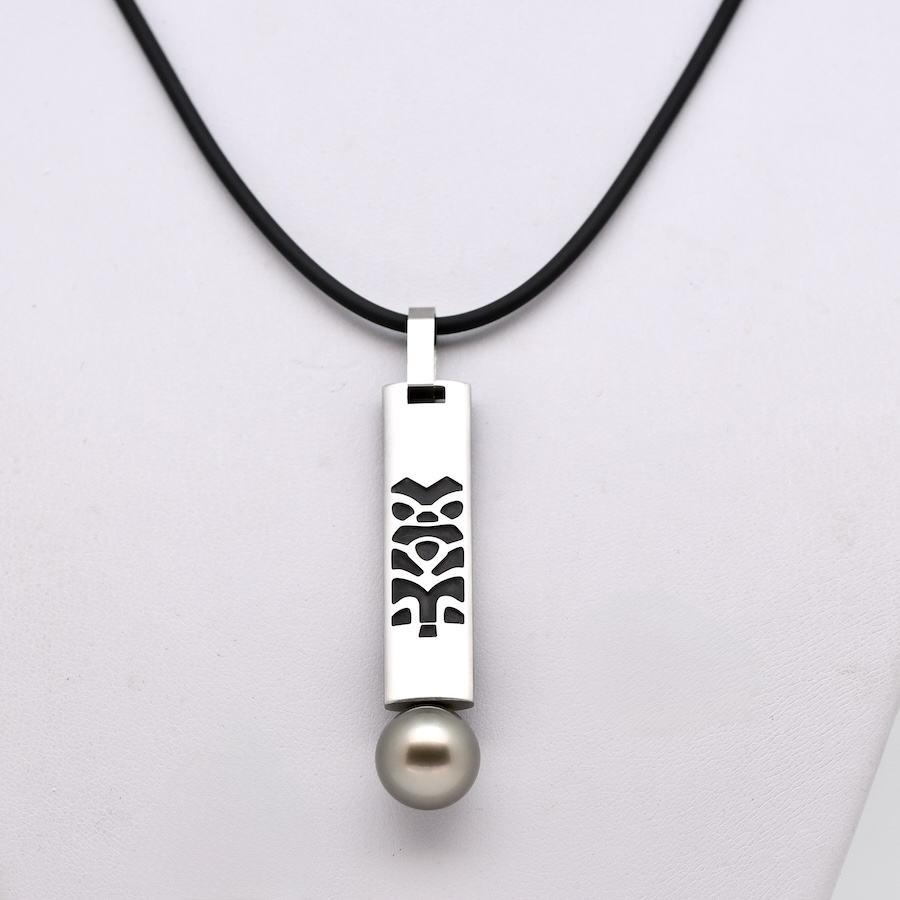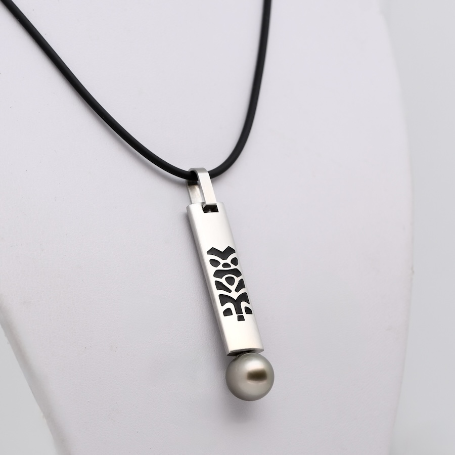 L’acier inoxydable utilisé pour Lokua présente une finition brossée soigneusement travaillée. Cette texture satinée évite les reflets excessifs et crée un contraste subtil avec l’éclat naturel de la perle de Tahiti. Les motifs polynésiens noirs, appliqués avec précision, renforcent l’identité du pendentif. Ils évoquent les racines océaniques, les tatouages traditionnels et les symboles ancestraux qui font partie intégrante de la culture polynésienne. Ces motifs ne sont pas décoratifs au hasard : ils rappellent la transmission, la protection et le lien fort entre l’homme et l’océan.