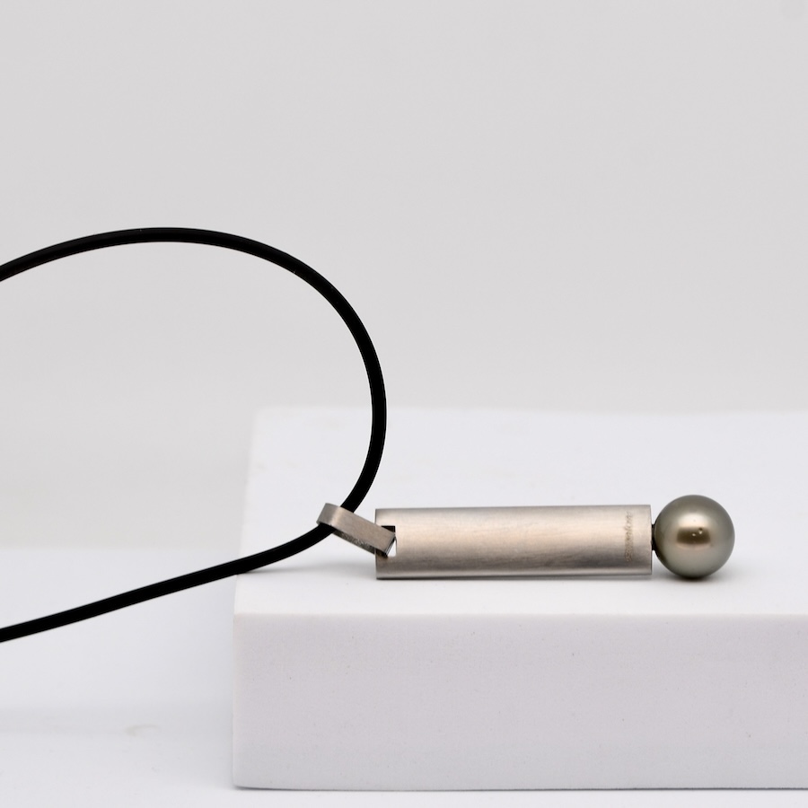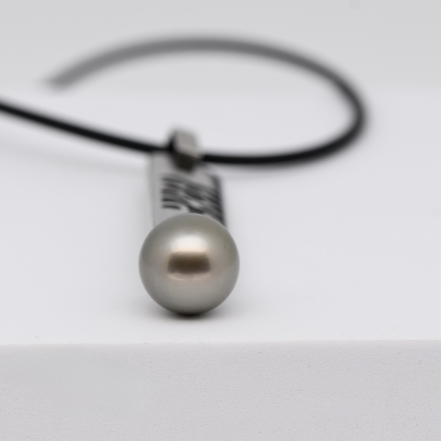 La couleur de la perle choisie pour le pendentif Lokua est un gris naturel, profond et homogène, sans aucun traitement. Cette teinte sobre et élégante s’accorde parfaitement avec l’acier inoxydable brossé, créant un ensemble cohérent et équilibré.
