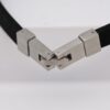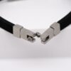 Montage : Bracelet articulé large, composé d’une plaque en acier brossé ouvragé ornée de motifs polynésiens, de deux bandes de silicone noir et d’un fermoir en acier brossé sécurisé